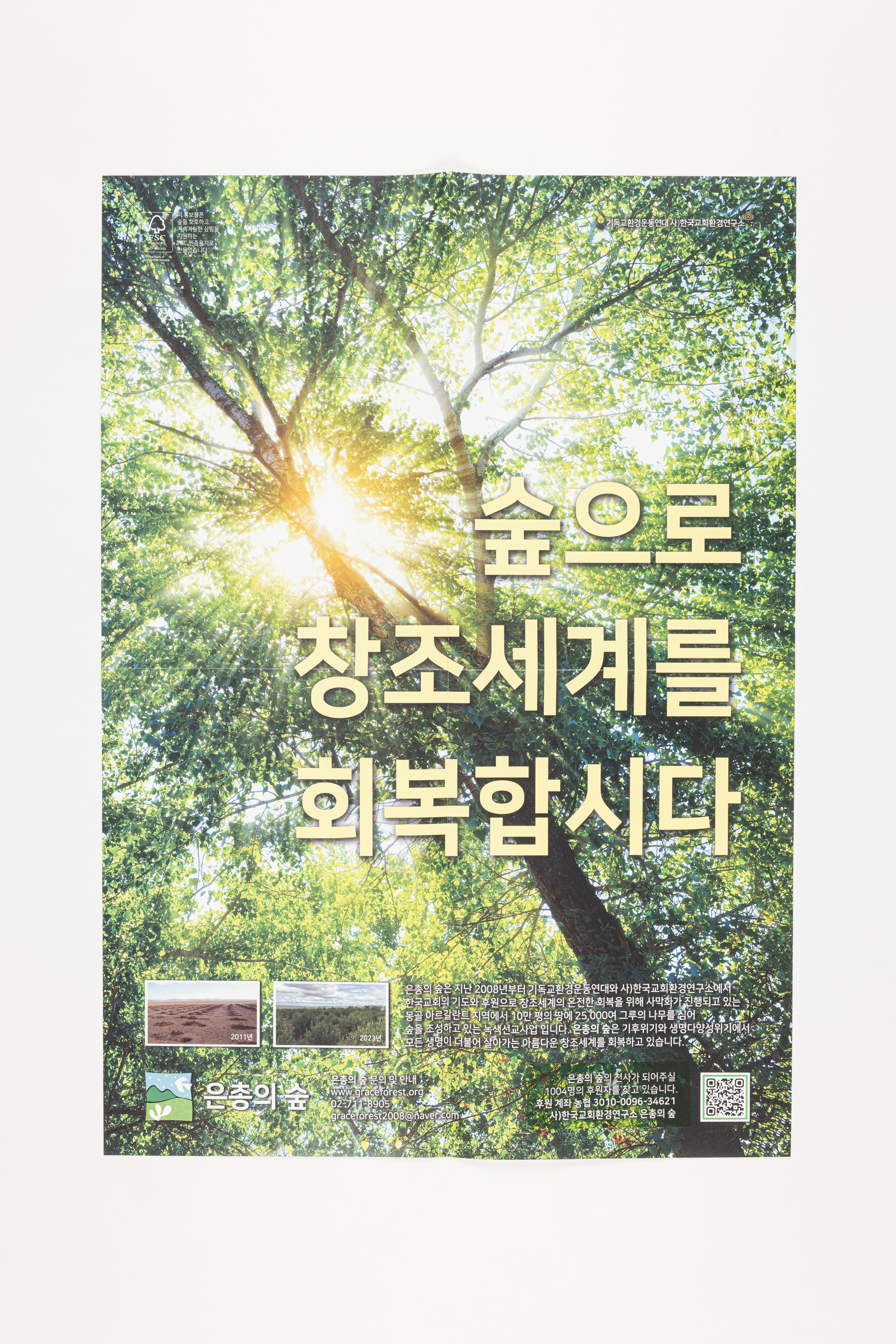 2008년부터 기독교환경운동연대와 사)한국교회환경연구소에서 한국교회의 기도와 후원으로 창조세계의 온전한 회복을 위해 사막화가 진행되고 있는 몽골 아르갈란트 지역에서 10만평의 땅에 25,000여 그루의 나무를 심어 숲을 조성하고 있는 녹색선교사업임. 후원요청 포스터.