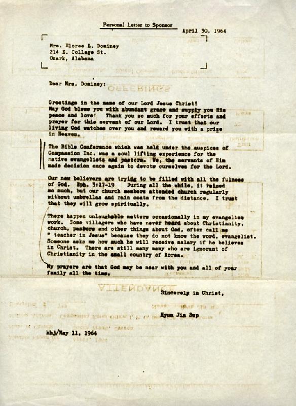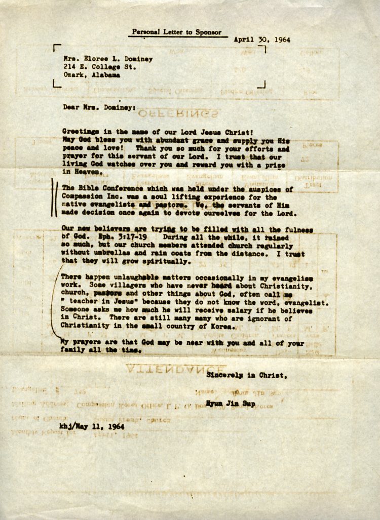 현진섭(Hyun Jin Sup) 전도사가 엘로리 도미니(Eloree Dominey) 후원자에게 보낸 편지로 후원에 대한 감사 인사와 한국에서 진행된 바이블 컨퍼런스에 참석하여 은혜를 받은 경험을 나누고 있다. 컴패션은 1964년 4월 13~18일 서울에서 바이블 컨퍼런스를 개최했고, 에버렛 스완슨 목사와 해롤드 S. 칼슨(Harold S. Carlson) 목사가 주 강사로 진행하였다.