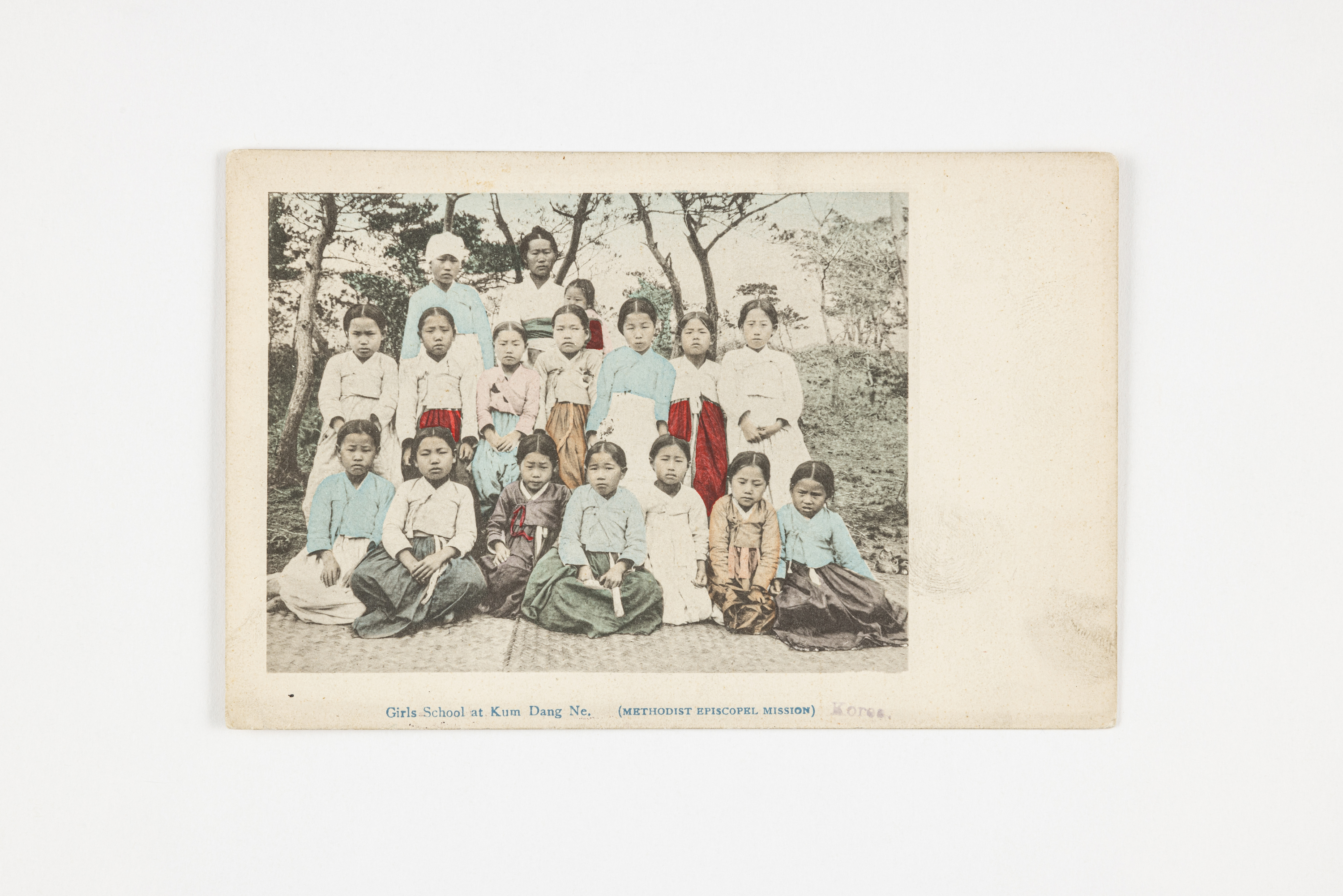 엽서 하단 중앙 Girl’s School at Kum Dang Ne(METHODIST EPISCOPEL MISSION) KOREA라고 인쇄되어 있음. (평안남도 온천군 금당리 소재 금당네 여학생 학생들)