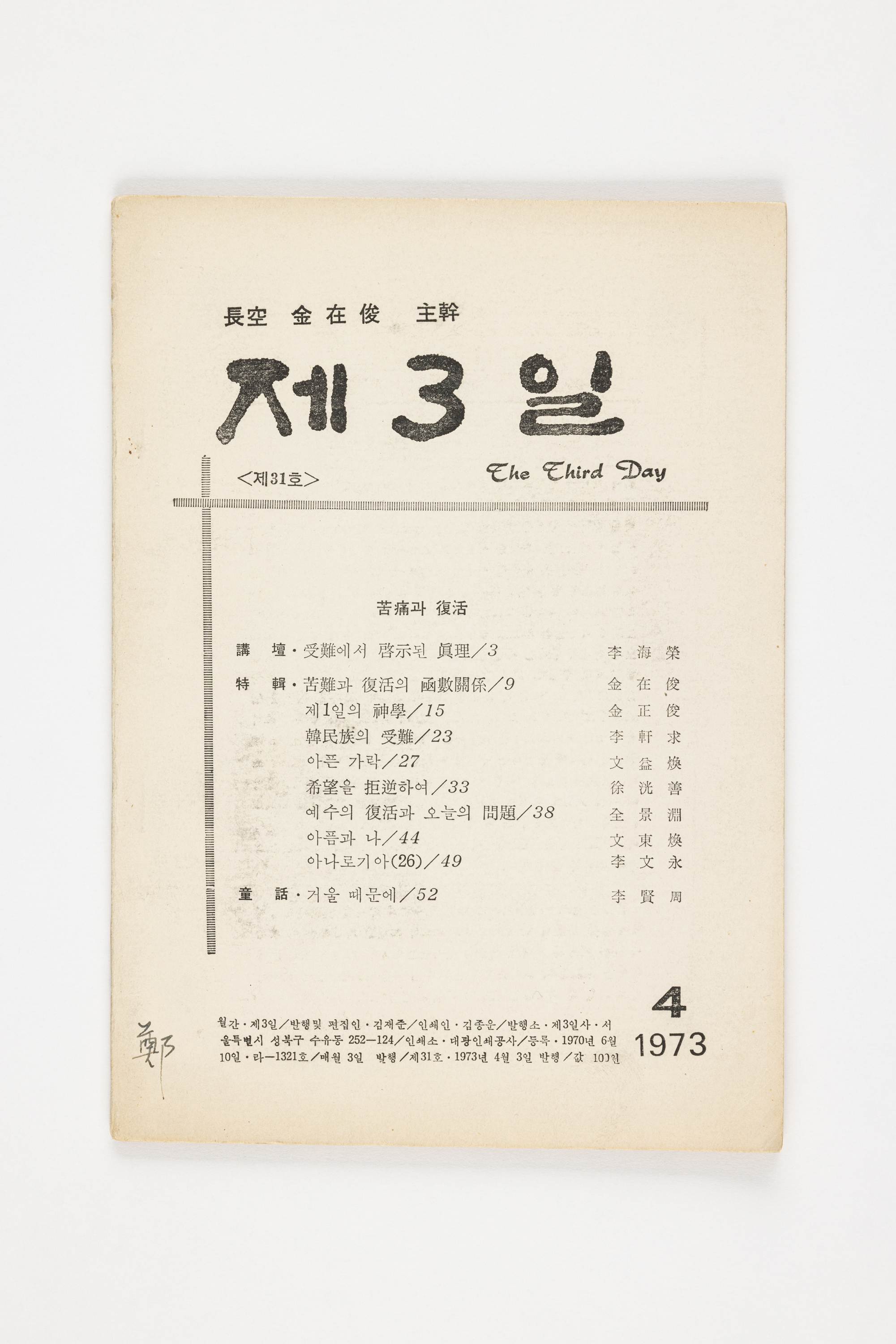 1973.4.3.발행. 56쪽. 이혜영, 김정준, 이헌구, 문익환, 서광선, 전경연, 문동환, 이문영, 이현주의 글 수록.