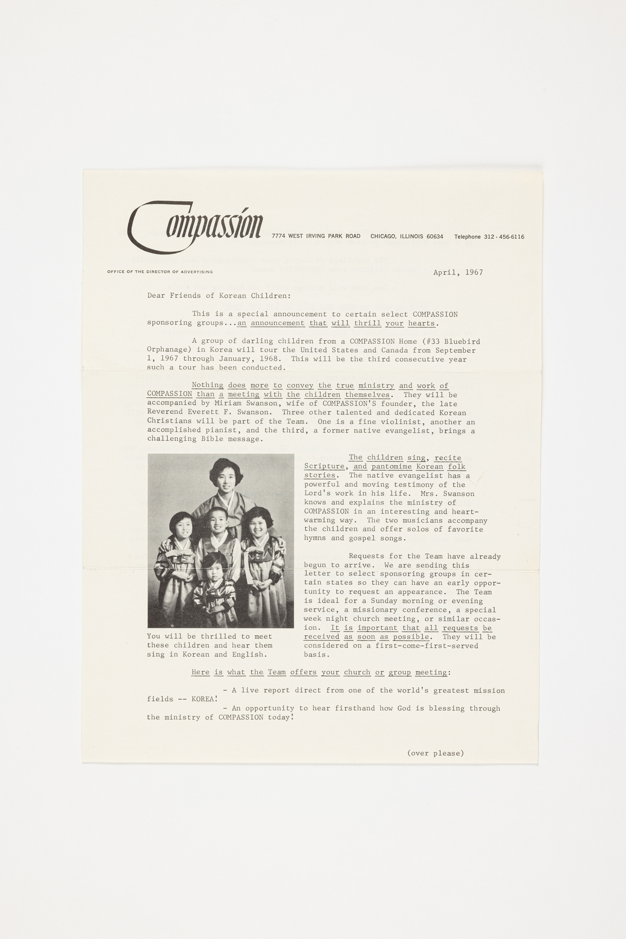 1967년 10월부터 1968년 1월까지 Bluebird 보육원 어린이들이 미국과 캐나다에 방문할 예정이라는 내용이 담긴 편지. Robert E. Swaney 작성