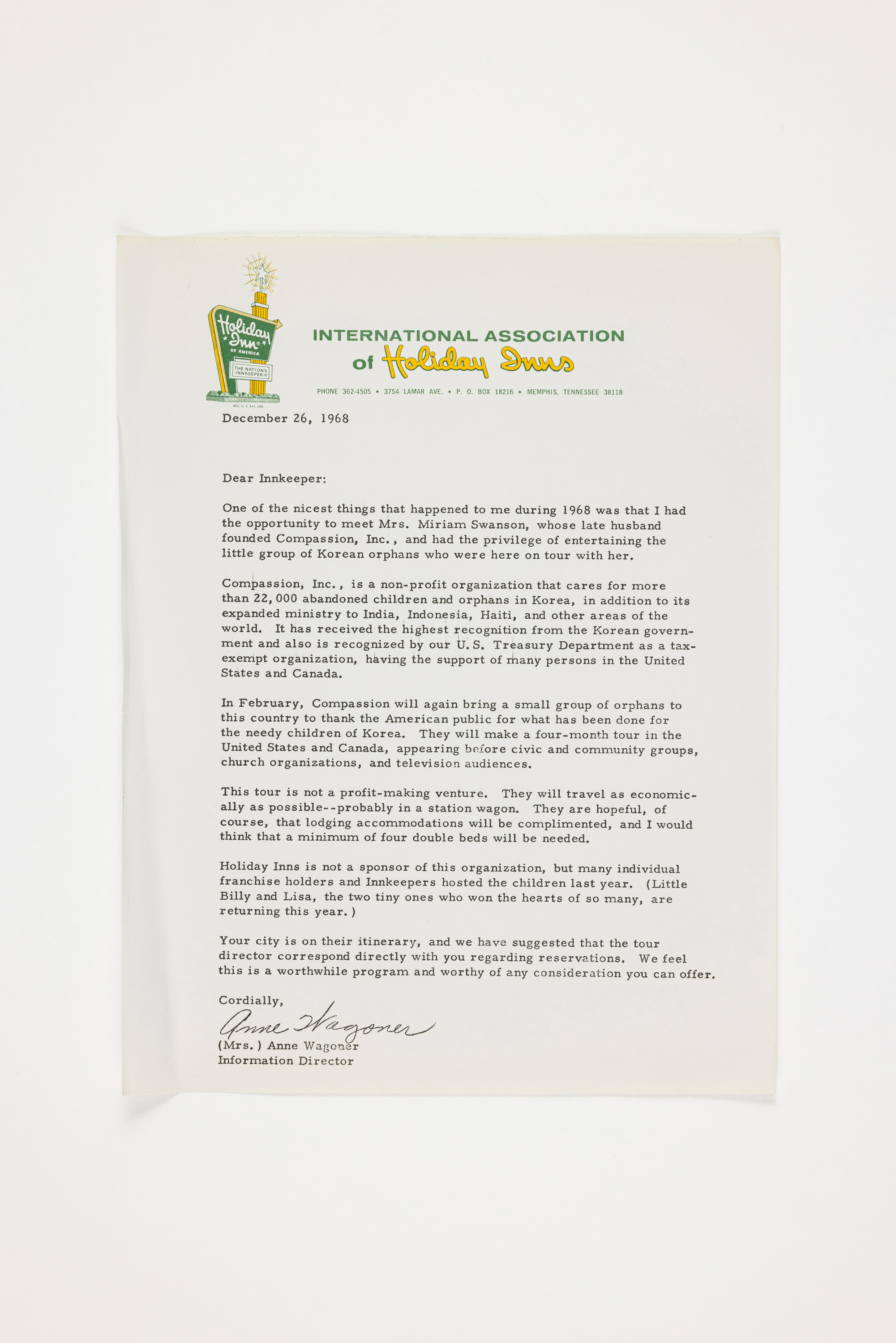 Anne Wagoner가 스완슨 부부를 만난 이야기와 컴패션 사역을 소개하며, 편지 수신인에게 컴패션 투어 어린이들을 위한 숙박 예약을 요청하는 내용이 담겨 있다.
