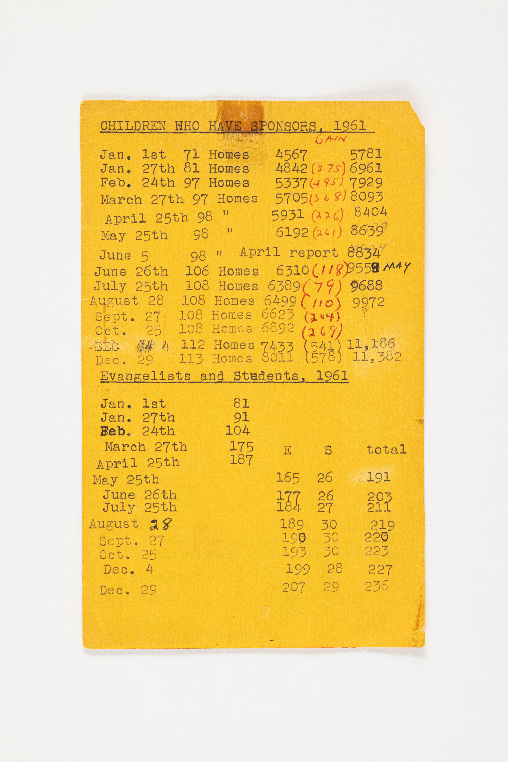 1961년 후원자수 보고 기록(CHILDREN WHO HAVE SPONSORS)