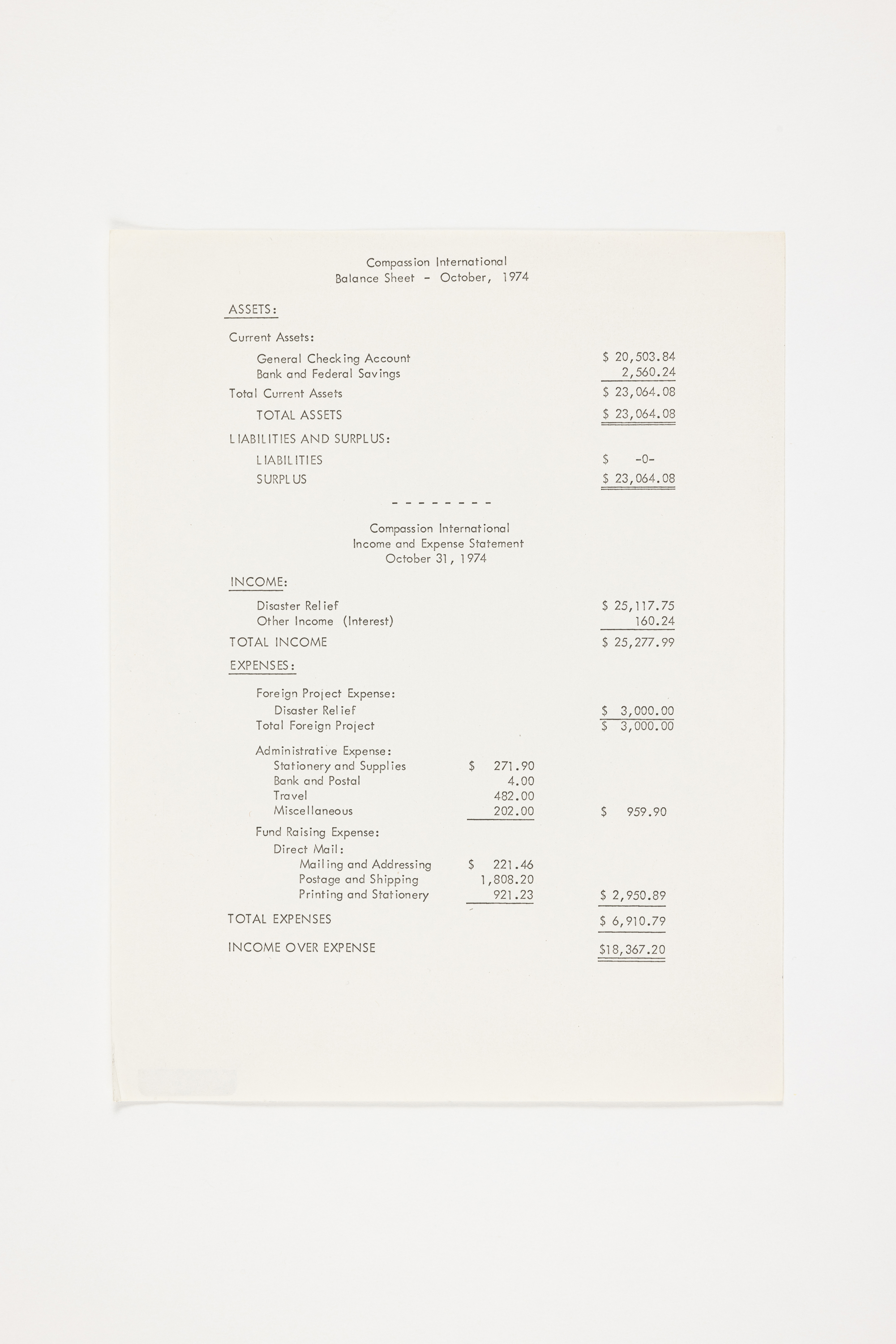 1974년 국제컴패션 대차대조표