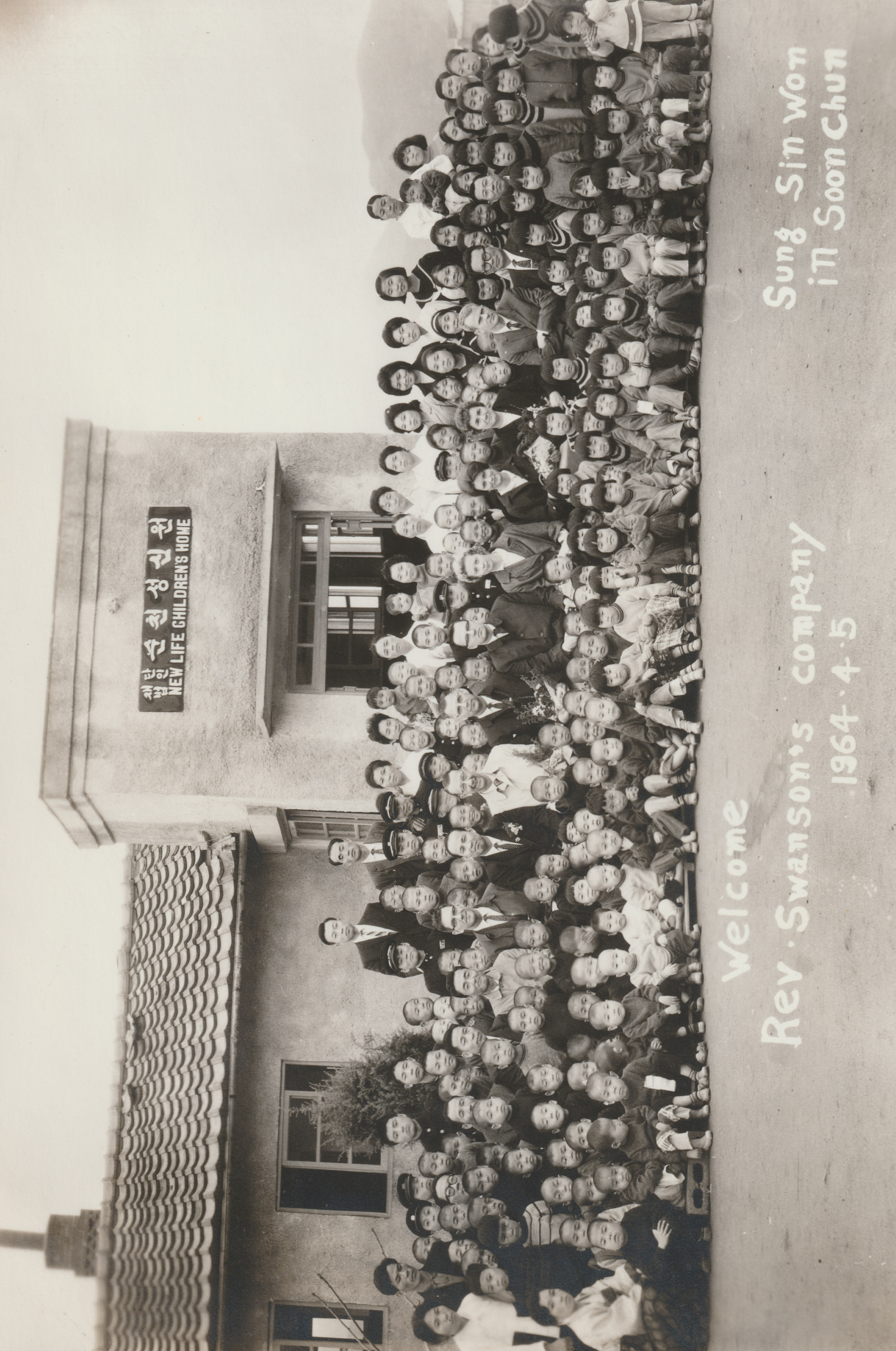 순천에 있는 성신원(New Life Children’s Home)에서 촬영한 사진이다. 사진 중앙에 에버렛 스완슨, 왼쪽 옆으로 거스 햄월(G.A. Hemwall) 이사, 피터 강 한국 비서, 로버트 모건 한국 사무소 대표가 순서대로 보인다.